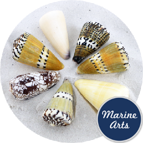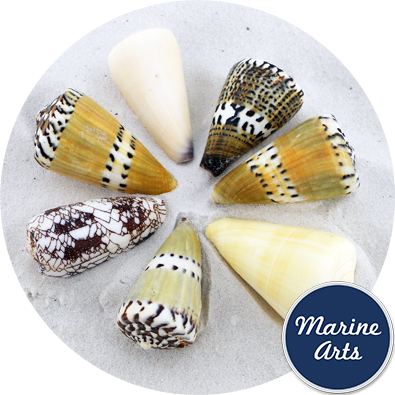 Cone shells carefully selected to reveal their stunning markings. One of the most colourful and popular shells for amateur collections and experiential learning.